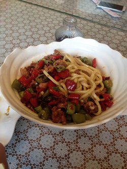 慕名而来,他家有两个店址,另一个是在3.3大厦的5层。        据说很多明星都来过他家店哟        来晚一点就需要排队了,幸好我们11点50就到了。到的时候前面有3桌,小等了一下。        要的辣爆小公鸡面,三四十块钱,价格小贵,等的时间微长,不过上来以后挺让我惊艳的。很大一碗面,上面是青红椒和小公鸡肉,拌完以后,特别特别的好吃,酱料超级赞,面也很劲道,感觉面里放了鸡蛋似得,很弹。        他家水只有信远斋小地雷款的酸梅汤,和小瓶的矿泉水。         看墙上他家还有炒菜,下次来一定尝尝其他的。…Read More