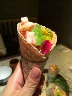 有喜屋这家店开在延安西路上,这里交通非常方便,这家店面不大,但是生意很不错。它家的手握寿司点的食客很多,所以也点了份。寿司的外皮是用冰淇淋蛋桶做成的,里面放了新鲜的三文鱼肉和水果丁,入口鲜美可口,非常好吃。…查看更多