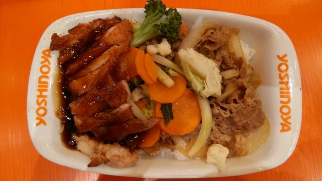 这家店是家快餐店,在广州有挺多分店的吧,店里装修简洁大方,环境也干净整洁,服务员态度也还不错,点餐的时候正好有个顾客找茬,服务员也没说什么,现在的顾客吃个快餐还这么拽。我要了他家双拼饭,这个还是很经典的,份量够足,算是两荤两素吧。牛肉是牛肉卷做的那种 ,不是一整块的,鸡块做的也可以,没有很油腻,蔬菜也不多,是个点缀,就有一朵西兰花。整体味道还不错,挺好的,另外还要了个蔬菜沙拉和紫菜蛋花汤,汤是现冲的速溶的那种吧。总体还行吧。…查看更多