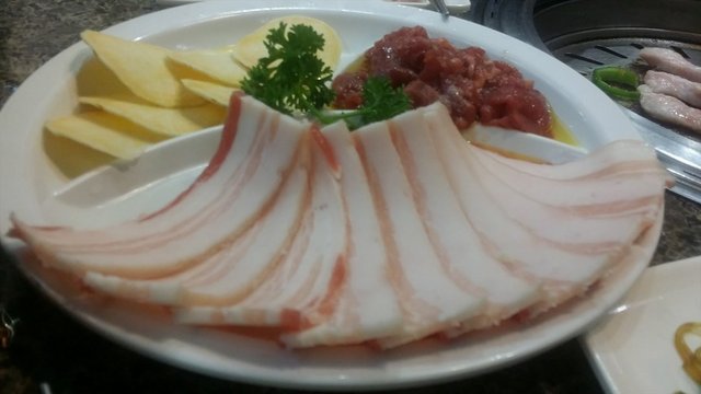 团购了双人套餐去吃,环境可以。送了小吃,南瓜粥,不过不可以免费加。我喜欢吃南瓜粥,好好吃的。团购的拼盘,五花肉三拼,有薯仔,五花肉。烤五花肉,看起来肥肥的,不过吃起来,再加上酱吃,超好吃的。牛胸肉,感觉烤得有点过了,有点老。石锅拌饭,加点拌饭酱拌匀饭,味道超正的!好吃!…查看更多