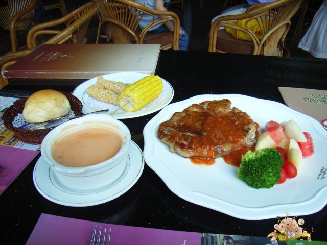 因为就在天河公园内,所以逛完公园再来这里用餐,还是非常方便的。餐厅分为室内和室外两个部分,装修比较雅致,环境不错,服务也非常有水准。这里有西餐、中餐等各种品种,选择还算比较丰富。点了鸡扒、番茄汤、玉米棒、面包等,鸡扒做得比较好,烤的很外酥内嫩,口感很香;玉米棒非常甜;面包口感松软,不会太甜。这里用餐的人不多,有优美的音乐,就餐的环境让人心情很舒畅的。…查看更多