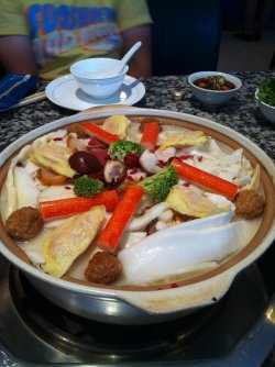 第一次吃这家店的时候我们三个人去的,当上锅底的时候下了我一跳,满满一锅啊。里面有蛋饺,蟹肉棒,笋....我们点了带肉的骨头,真是后悔了,因为只要啃上两根,肚子就饱了。汤很鲜,调料是自助的。锅底上来后服务员会先帮你把骨头撩出来,等你想吃的时候再放下去过一下,要不然满满一锅动也不能动啊哈哈…查看更多