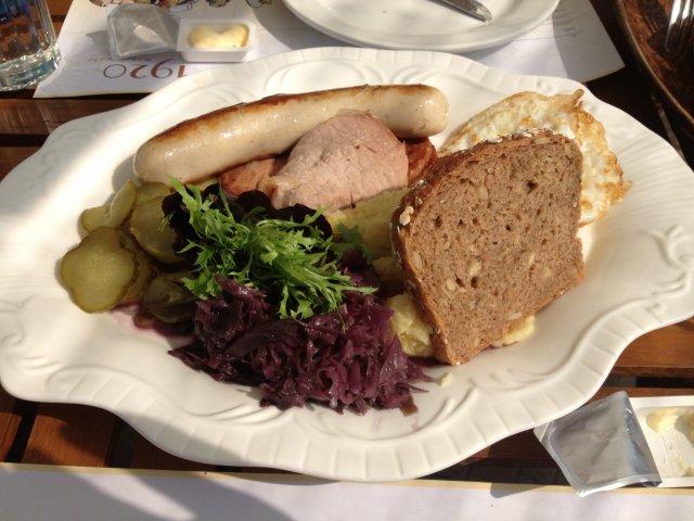 第一次和朋友吃德国菜,这里的德国猪手和啤酒很出名,所以来试试.我们两个人点了德国香肠,咸猪手,上菜前会有面包和黄油做前餐,香肠吃起来还不错比中国的香肠好吃,吃起来不会觉得里面都是淀粉.咸猪手外脆里香,非常不错.一只猪手我们两个女的都吃不玩. 非常喜欢这里的环境很小资,在市区能有这样一个吃饭的地方非常棒.…查看更多