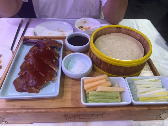 今日同老公過深圳皇廷广场閑逛,晚上到這間北京菜館晚飯。這間裝修得像老北京特色,朋友介紹這裏的果木烤鴨和貝勒爺烤羊肉一定要是試,真係冇介紹錯,鴨皮香脆油而不膩,用薄薄的餅皮配上哈密瓜、青瓜、大蔥和醬汁包住來吃,大口咬下去Yummy😘羊肉也是好吃,小小爐火烤着薄薄的羊肉,一點羶都沒有,嫩嫩的肉配上大蔥洋蔥一起食,正👍…查看更多