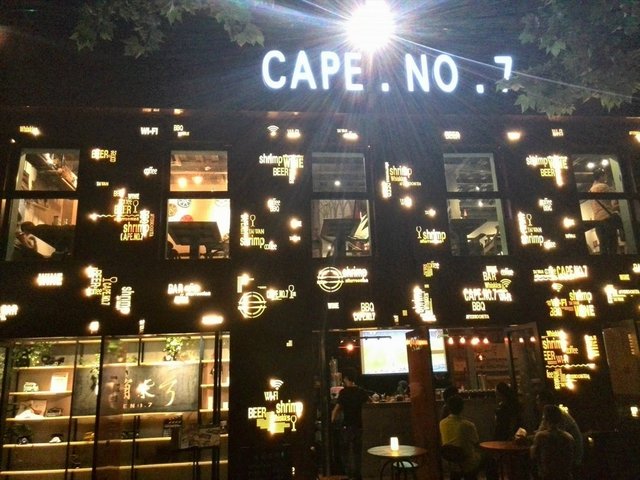 Cape No.7,最近在朋友圈很火呢,于是乎慕名前往,一探究竟。她家开在南山路边、绿杨路上,再具体点就是美院对面、玉玲珑边上,地段那是好得不得了~入到她家,一口门口的大屏幕放着球赛,很应当下的景啊~哈哈~由于俺们去的有点晚了,一楼已然饱满,只能上到二楼;走过楼梯处,瞬间被墙上的美图吸引:一幅中,海风吹着姑娘的头发飘着,虽然只有背影,依然十分唯美;另一幅中,一对老夫妻在风中相拥,十分不舍的样子似乎是在道别,很是凄美。上到二楼,便能见一巨大的帆船模型,很应店家“海”的风范和元素,赞哦~西湖边有调调的吃饭地儿很多,她家主打台湾特色。俺那天去的时候,有幸遇到老板也在呢,一口可爱的台湾腔,十分幽默!#台南棺材板# 介道菜貌似是店里招牌,老板极力推荐的,一试之下,果然非同凡响,秒杀之前俺吃过的所有面包诱惑系列啊。脆脆烤好的面包土司,内乘着奶油海鲜汤,当然海鲜料也十足,相当之美味啊~#柠檬虾# 说实话之前以为太海岸的柠檬虾已然很好吃了,直到吃了她家的才知道,在美食的道路上,追求是绝无止境的呀~一句话,秒杀了台海岸的柠檬虾喽~尤其喜欢那用鲜柠檬调制的汤水,实在是让人流口水啊~另外,她家还有很赞的烧烤,不仅是荤食,更有蔬菜,例如蘑菇、玉米棒子,都是相当赞,烧烤类的能保有食材噶多的水分,真心有水准的啦~想来世界杯降至,来到此处,喝喝啤酒、吃吃烧烤、看看球赛,相当惬意啊~俺们临走的时候,已经很晚了,出了大门才发现,店家还把她家的招牌用投影的方式映射在了门口对面的墙上,实在是好创意啊!美~…查看更多