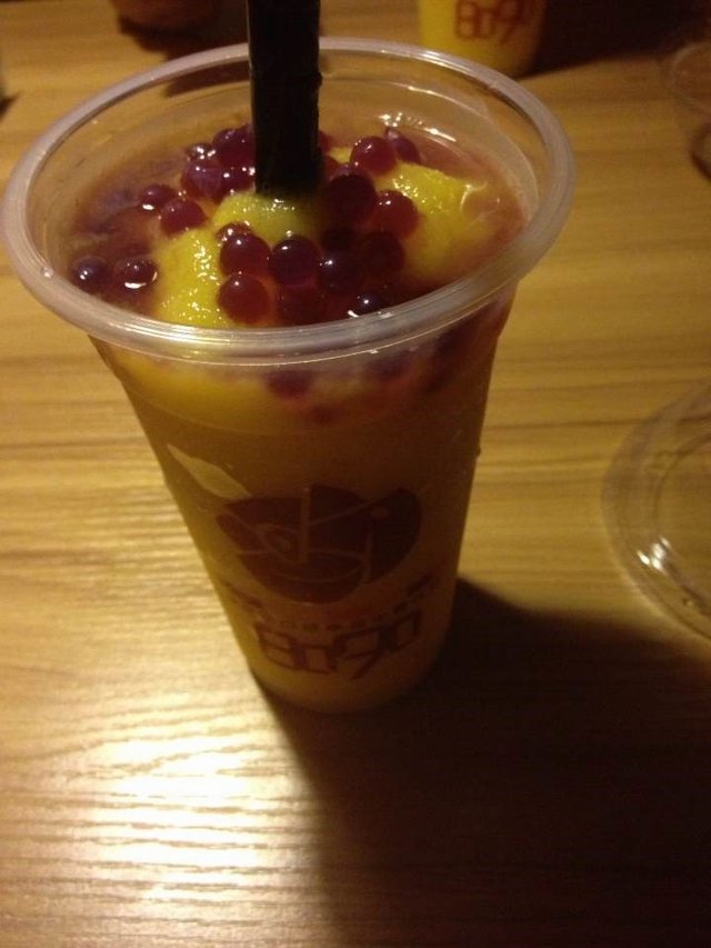 晚上来8090这里消磨时间的,店里面人不多,环境还是可以的,点一杯饮料就可以在这里坐很久了,有空调有wifi,相当不错。这杯饮料叫什么忘记了,口感还不错,里面放了好多芒果,芒果有种软绵绵的感觉,不过很甜,可是用吸管吃芒果有些困难哎,总体温度还可以,不会很冷,而且晚上喝点果汁也不怕长胖,店员很有礼貌…查看更多