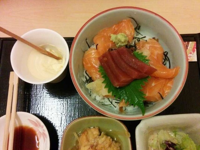 人气还挺旺的一家日料店,选了他家中午的三文鱼金枪鱼盖饭定食。三文鱼和金枪鱼的切片很大块,吃口很新鲜,能吃到鱼肉的鲜甜,味道还是挺不错的。70元左右一份的价格,也不算太贵,性价比一般,偶尔试试不错。…查看更多