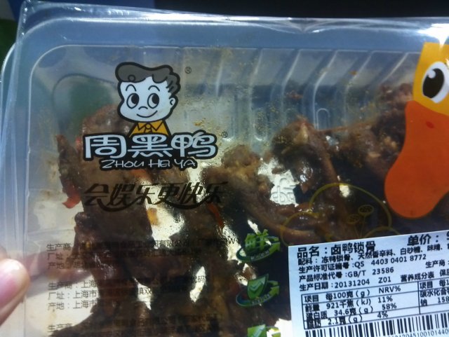 周黑鸭有很多的店面,店面普遍都是小小的一个小格子,店铺前放个玻璃橱柜。在这附近逛,看到了这家周黑鸭,想吃点辣的小吃。我比较喜欢吃有骨头的,所以就选了鸭锁骨,买了两盒回来吃,比较实惠,一盒才9.9RMB,鸭锁骨卤的很浓,吃起来麻麻、香香、咸咸的,骨头都差点被我给吃了,吃了会停不了口,会想一直吃下去。…查看更多