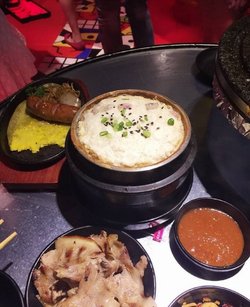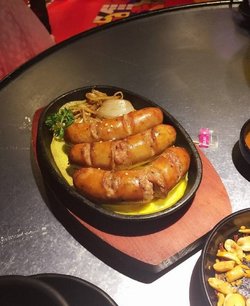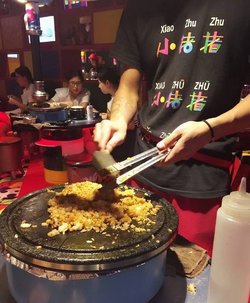 小猪猪烤肉老远就看见了,非常的好找,门前有三只猪的店就是它了,里面环境比较暗一点,比较有喜感的一家餐厅,点好菜然后就有小哥上来炒饭,然后就看到往里面放了大把大把的芝士,吃起来拉丝可以很长呢,香肠口味偏咸,石锅豆腐嫩嫩的,好吃呀。…查看更多