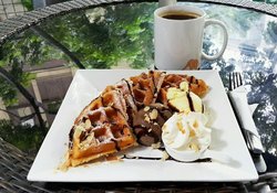 休息的时候都会来这里小憩一下 环境不错布置的很温馨 杯子是长颈鹿的图案很可爱的 拿铁 卡布奇诺咖啡口感都还不错 冰激凌华夫饼很好吃 两个冰激凌球入口即化的 华夫饼热乎的时候吃很松软 口感很好…查看更多