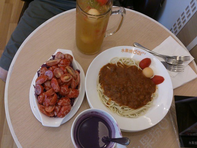 水果捞,作为系以水果为主题的悠闲店,做的味道都唔错,价钱还算系比较实惠的,当然吧,原价都几贵,但现在的优惠真系好多哦。我就中意呢度的套餐,之前买,好实惠,分量足,即使两个人吃都足够。紫薯热露,呢个系秒杀的,唔错,好稠,紫薯味香。番茄牛肉意粉,分量好足,番茄酱足够多。沙律,用的系番茄仔,超级多啊,一个人吃的话,就肯定吃唔晒,味道都非常好,新鲜。仲有就系柚子气泡水,好大一杯,味道清爽,适合夏天的饮品,酸酸地,感觉舒畅啊。番茄牛肉意粉+饮品+沙拉,先系27元的单人套餐,性价比就非常高。…查看更多