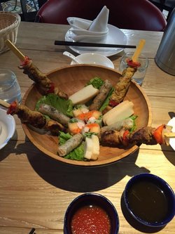 泰盟金阁这家店是朋友请客的时候光顾的,这家店开在陕西北路上,店面宽敞,非常容易找。比较中意它家的小吃拼盘内的烤鸡肉串,鸡肉特别的大块,应该有腌制过,鸡肉混合上洋葱和红辣椒片一起串在竹签上烤,把洋葱和辣椒的味道都烤入肉内,非常好吃。…查看更多
