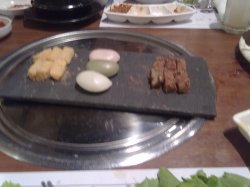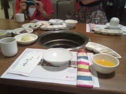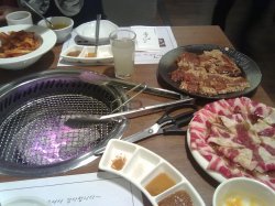 在网上团购的,约了2个好友一起去吃。团购的东西很多,有生牛小排、宫廷调味猪排、古法酱汁薄片牛肉、 大酱汤、炒辣年糕等。我觉得猪排很好吃,很入味,牛小排切得有点厚,不是很好烤。我们还额外点了米酒,口感很清香,团购里还有一份打糕,很糯,很好吃。…查看更多