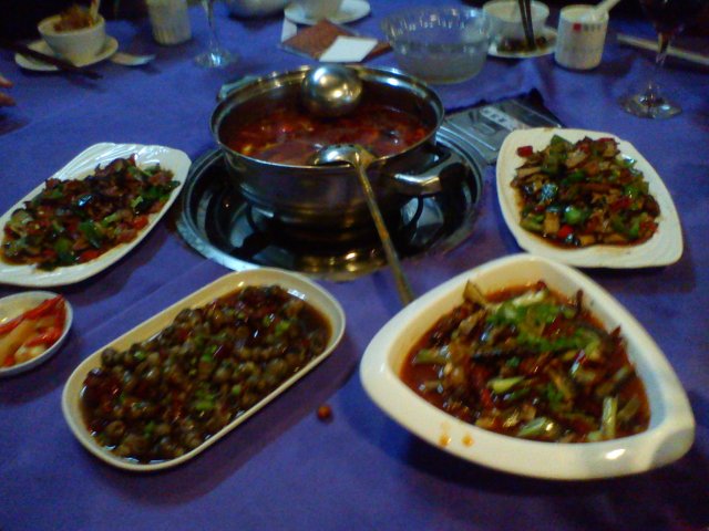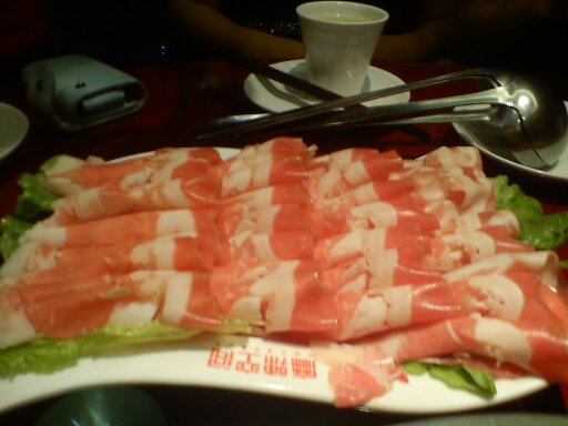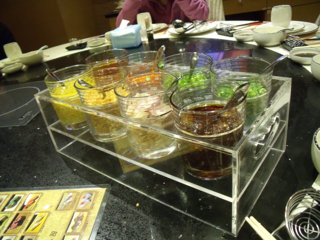 一碟碟精致的菜式陆续送上,服务员先剪开从四川运过来的一次性锅底,我们看着都感觉吃的放心呢。:)然后在锅底沸腾前,大家也在闲聊,红色的汤底沸腾之后伴随着阵阵香气,大家都食指大动,先把肉类都下锅,嘿嘿,都是MM大家反而都很放得开呢。