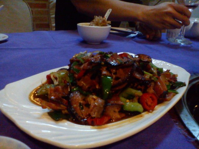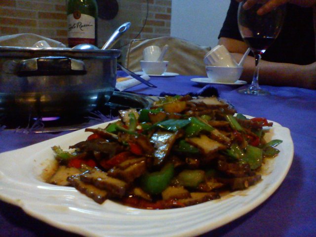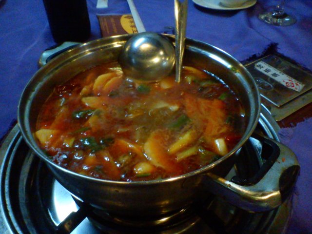 前面我们都吃了好多肉,味道很不错,腰花很爽脆,腌制过的排骨也很入味。吃过瘾了后面才陆续放菜。不过汤底比较辣,吃的大家热乎乎的,呵呵。