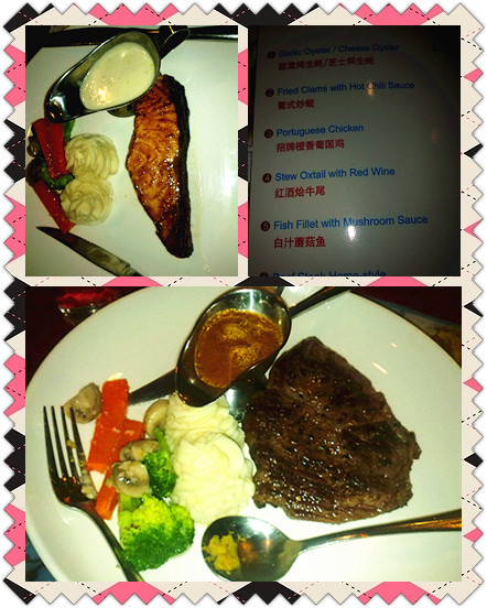 下次要等主菜上来再放开吃哦 澳门葡国餐厅 2012-06-04罗宋汤,很大的盘子,(让我再次想到,狐狸请客~~)味道蛮浓的,洋葱也不少(之后每道菜都用超级大盘子,直径月末29CM)配套的还有据说是赠送的烤面包片和面包条,脆脆的,不错。吞拿鱼色拉,应该说算是比较普通的一道色拉,他们家用黑醋拌的,所以作为前菜很是开胃。白汁蘑菇鱼,问了一下这鱼就是河鱼,可以放心吃,白汁嘛就是奶油,味道还好。招牌葡国鸡,量不是很多,味道一般,还是澳门路上的红子鸡的招牌红子鸡味道正一点呢~不过差强人意。咖喱蟹味道尚可,写好死比以往的小了一圈。还点了两个蔬菜,名字忘记特了~~好像,我们还点了类似骨肉相连的烤肉双拼~~反正类似烤肉串那样串着的~~哎呀呀,主菜上来了,七分熟的嫩煎牛眼牛排和芝士焗阿拉斯加深海三文鱼,真心的吃撑了(我的是鱼,怕牛排太大份,吃不了,想不到鱼也是超大份~~)…查看更多以上食记乃用户个人意见 , 并不代表OpenRice之观点。赞好分享下次要等主菜上来再放开吃哦 澳门葡国餐厅 https://s.openrice.com/KtLT100CPi200检举 净水器冲咖啡 好丰盛的晚餐啊~2012-06-05 回应 jennifer6666 (⊙v⊙)嗯,有点撑了呢~~2012-06-05 张贴 评分4味道3环境4服务5卫生3抵食推介美食嫩煎牛眼牛排 芝士焗阿拉斯加深海三文鱼用餐日期2012-06-01人均消费¥350 (晚餐)