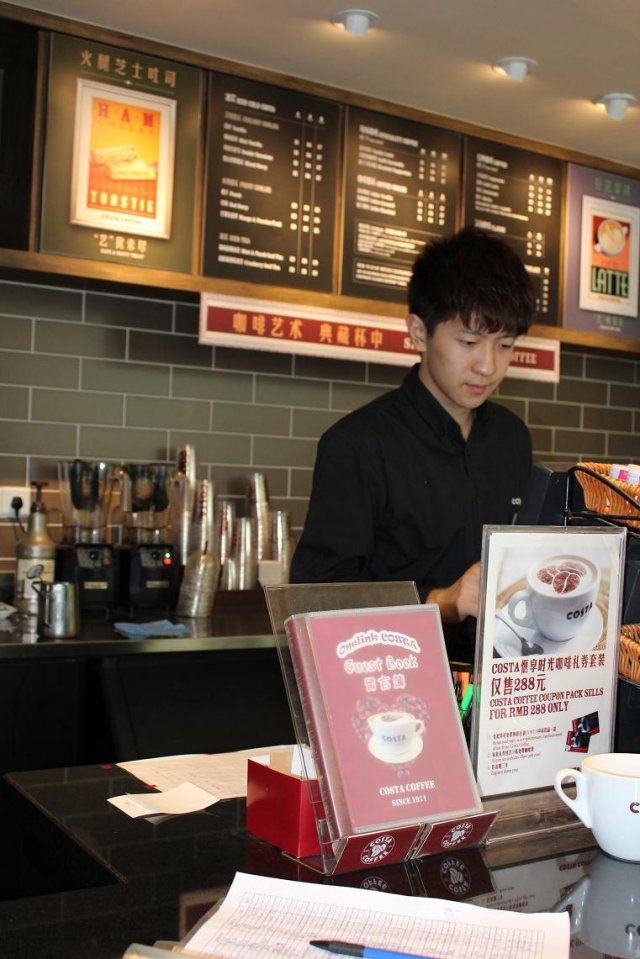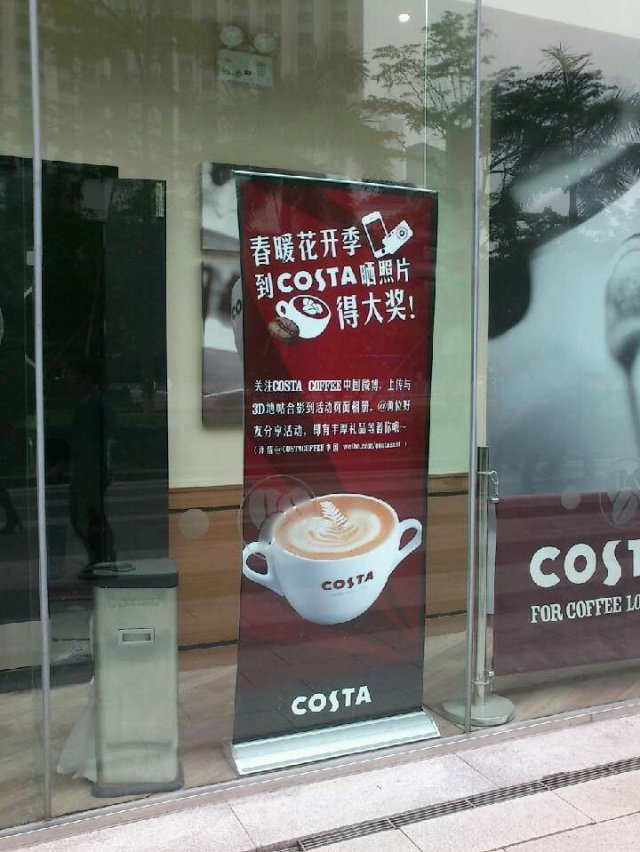 COSTA coffee 悦达咖世家 2013-04-15万菱汇整体给我的感觉都很好,因为很新很干净,一直都喜欢COSTA的咖啡,万菱汇这家刚装修过,重新开业了,这边的位置不是很多,但是环境真心的好,落地透明的玻璃,下午时间过来这边点一杯咖啡,再带一本书,悠闲地度过一个下午超好的哦。门口远远的就看到了这个海报,不知道哪里有3D的广告呢?COSTA的蛋糕也是很值得一试的呢,价格在20多到三十之间,不过大部分客人都是点杯咖啡而已,我也是这样,因为吃过午饭的话喝一杯咖啡都饱了,吃不下蛋糕。这里也有可以带走的饼干,价格不便宜哦,都要10元以上的呢。这里的收银小帅哥,每次来都看到他,心情大好呢。泡咖啡的也以为帅哥,连续几次来都是他两。今天过去喝的摩卡,咖啡味超级浓,偏苦,喜欢浓咖啡的朋友可以试一下哦。我最爱的拉花拿铁,多奶多糖的拿铁永远是我的最爱,上面厚厚一层奶,下面是香浓的咖啡,再加两杯糖液,简直是超级棒了。这边的卡布奇诺也是挺不错的,没有拍照片,咖啡外型都是差不多的。这边的糖包吸管什么的都是自助的,非常方便。因为COSTA的咖啡都是现磨现做的,所以等待的时间有点久,如果赶时间的盆友不建议去哦,COSTA是一个休闲的咖啡厅,适合偶尔过去小资享受一下的。这边的咖啡小杯的话一般是31元哦~价格虽然有点小贵,但是品质确实是有保证的,味道非常不错。…查看更多+ 4以上食记乃用户个人意见 , 并不代表OpenRice之观点。赞好分享COSTA coffee 悦达咖世家 https://s.openrice.com/KtLT0m0uXy2W0检举 张贴 评分4味道4环境4服务4卫生3抵食
