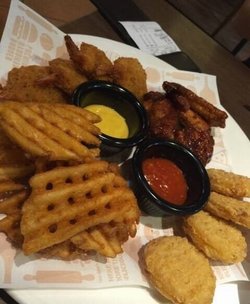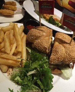 一边上班的时候就和同事约好要去吃拉亚汉堡的,去之前同事还帮忙团购了代金券,蛮划算的,比用钱买便宜了10%,牛肉汉堡好吃啊,非常的大,切成两半,刚好一人一块,面包比较干,牛肉很厚,香味足,小食拼盘里面薯格和鸡块蛮好吃的,都特别的香脆,薯条也不错。…查看更多