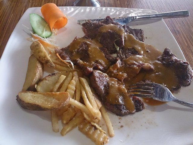 感觉这家西餐厅还挺低调的,位于美食广场一个角落里面,宣传也不多,所以人气也不是很旺,服务态度很热情,而且二楼的面积挺大的,环境也有西式的浪漫感觉。GP招牌牛扒,是这里的招牌主食,价格也不贵,可根据个人喜好选择几成熟,酱汁也有几种选择,牛肉口感很嫩滑,品尝的出来是比较新鲜的。…查看更多