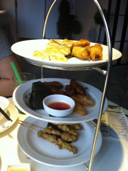 先说一下,我是在淮海路星怡汇试营业的时候去的那时人不多,不用等位还有餐前小食送,还打折,非常划算哦!店内的装修非常有意思,进门处有可爱的指示牌还有圆形拱门造型的等位区,让等位的客人有一种很惬意的感觉里面的座位也摆放错落有致,间隔比较大不会让客人用餐时有不舒服的感觉整体风格有点像小资一点的咖啡馆,给人雅致安静的feel用餐环境可以说是非常不错的!纸质菜单,现在非常流行的一种点餐方式餐前小食:龙虾片和荔枝PS:龙虾片好好吃,又脆又香,还有一点点微微的辣味吃起来有点像农心的辣味的虾条(大家吃过吗?)荔枝也很甜,水分很足!【芒果宝宝】很可爱的名字,忍不住点了芒果果昔的感觉,有点厚的,不是很薄的果汁的那种冰冰凉凉的,挺适合夏天解暑的【酸辣鸡丝檬粉沙律】非常可口的开胃菜,酸酸辣辣又很清爽,也非常适合夏天享用檬粉细细的但是很有嚼劲,鸡丝量也挺多的上面洒的花生仁给这道菜加分不少,很脆很香我和老公都非常爱这道菜!【文东海南鸡】量比较少一点,搭配了三种酱料海南鸡的卖相非常不错,看着就垂涎欲滴了肉质还是很鲜嫩的,外皮看上去有点透明很新鲜每一款酱料都有自己的特色,我喜欢每个都沾一点。。。【蒜蓉牛油扇贝】18元/2只扇贝个头很大,很饱满味道鲜美多汁,应该是非常新鲜的我是个不怎么喜欢蒜味的人,但是这个做法蒜味并没有很刺鼻反而更好的提了鲜味,还是不错的!【摩天轮小食拼盘】造型和我以前在虹口店看到的不太一样不是摩天轮造型,而是下午茶蛋糕塔的造型不过无所谓啦,主要还是看食材如何第一层:墨鱼饼+鸡肉春卷+鸡肉快之类的吧第二层:粽子+虾土司+鸡翅第三层:肉串总体来说其实都差不多的味道,比较油腻,不是很推荐哦!【咖喱牛肋条】东南亚风味的咖喱还是非常不错的浓浓的咖喱香,非常的下饭,所以建议大家配一碗白米饭哦不然实在太浪费了!牛肋条还是很新鲜很酥嫩的【炭烧猪颈肉】和别的地方尝到的差不多猪颈肉肉质肥嫩弹牙,很入味,微微的甜味恰到好处在配上秘制酱料,为这道菜增添不少风味!【榴莲泡芙】压轴的榴莲泡芙是每次去必点的甜品好像涨过价了吧~~~外面的酥皮很酥,很香里面的榴莲酱非常的浓郁我其实是个不太会吃榴莲的人但是这个泡芙的榴莲味绝对是我可以接受的味道那股比较让人不舒服的榴莲特色味道并不是太重和芝士味道结合的刚刚好,非常推荐非常棒!因为新店开张,打了折这么一大桌菜才两百出头,非常划算哦!其实就算不打折,我觉得这里的菜价也不算贵,性价比还是很高的!这里环境舒服,也很适合家庭聚餐周末带上家人过来尝一尝东南亚风味,让老人家尝个鲜,也是非常不错的选择嘛!…查看更多