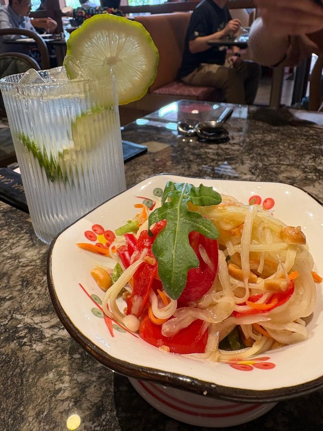 餐廳裝修有泰風味Seating唔錯坐低後,侍應便送上4至5塊大蝦片作餐前小食平日午餐時間有lunch set幾十蚊人仔有前菜+主食+飲品我點了2份午餐前菜有木瓜沙律飲品有凍檸檬梳打 (單購已是20人仔,但跟餐是免費的)主食有青咖哩雞飯58和甲拋葉肉碎蛋飯42另點了沙嗲串燒雞48和炒蝦膏通菜45埋單連餐位費,每人16 ,合共209人仔價錢在cocopark 算相宜至於食物方面個人覺得沙律與飲品都調得不錯👍🏻通菜要求少咸,廚師有做到啊👍🏻雞串燒就有4大串,但味道普普通通,沙嗲亦不夠香,雖然不想浪費食物,但我們2人都食剩1串青咖喱雞青咖喱用嚟送飯都唔錯,但對我而言唔夠辣唔夠香肉碎蛋飯都屬普通質素,不夠惹味,但以呢個42人仔價,是絕對可接受以午餐價格和食物質素來衡量,性價比算唔錯!…查看更多