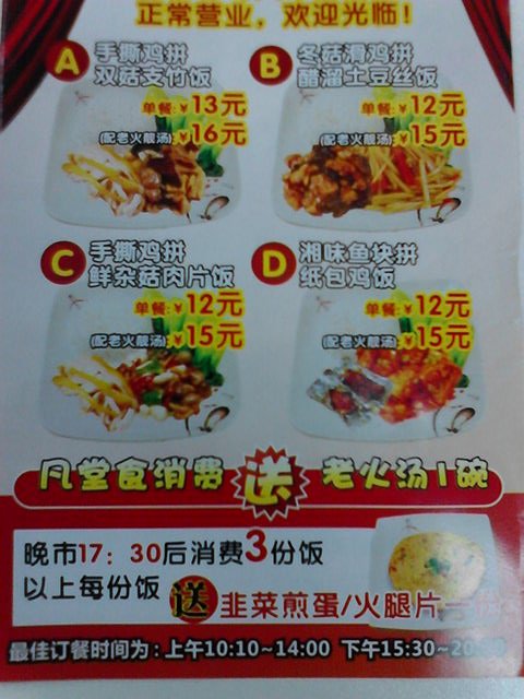 餐厅主营是快餐,有一次和几个同事去点了几个菜,其中包括一大盘麻辣烤鱼,真的是一大盘,用四方托盘装的,58元,配菜量很大,分量很足,不过不太吃得出烤鱼的味道,太辣了。拍青瓜很好吃,很爽脆。干锅千叶豆腐也不错,反正他们家就是擅长做香锅干锅那一类的湖南麻辣小菜。…查看更多