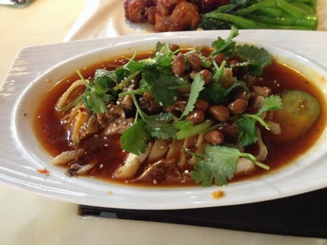 口水鸡--酸辣口味!     这道口水鸡鸡肉选材一般般,鸡肉比较老。不过调制的汁非常到位,酸酸辣辣的,还加上些花生粒。非常下饭。香菜调味道也非常赞。价格还可以接受吧。…查看更多