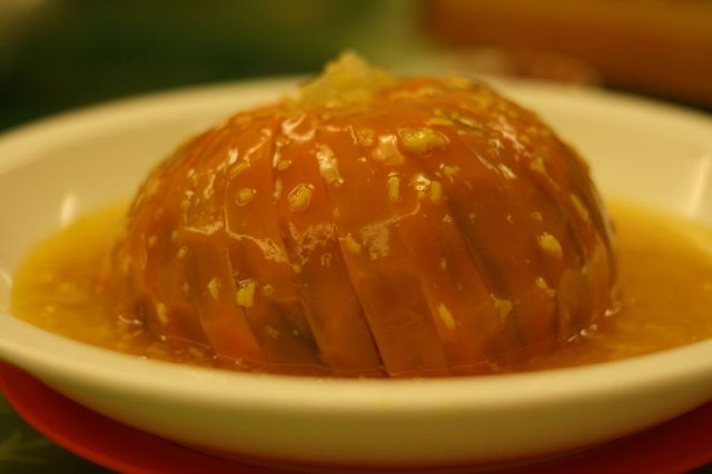 最先在桌上摆哒是一个剥了皮哒番茄,后来听了它哒出处才晓得是个“高科技”产品