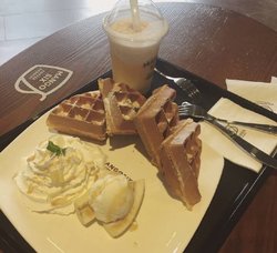 人广这里新开了mangosix以后就很少再跑到虹桥去了,休息天来过一次人很多,现在都是工作日过来,香草焦糖华夫卖相蛮简单的,香菜冰激凌味道蛮甜的,下面还有新鲜的香蕉作为点缀,味道蛮甜美的,华夫饼非常的脆,就是少了巧克力略显单调,芒果椰奶也很好喝啊,价格比较贵。…查看更多