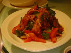 泰式凤爪:酸酸辣辣的,么有骨头,味道不错~加拿大三文鱼刺身(49米)+泰式冻腌生虾(79米):刺身很厚实~也很新鲜,强烈推荐那个虾,好好吃啊,微微的酸辣~泰式农庄牛肉沙律(42米):牛肉嫩嫩的,味道也不错~ 配上番茄、洋葱、青红椒、香菜啥的~越式大虾芒果沙律(46米):虾仁+各种各样的水果(芒果、火龙果、提子,etc)+沙拉酱蒜蓉牛油焗大虾(79米):哎呀呀,又是一个推荐的菜~~我爱cheese~ 很香很好吃哦~~越式大虾米纸卷(29米):皮儿里包的馅儿有虾、粉丝啥的~~那个蘸酱甜甜的很好吃哟~~~咖喱皇炒蟹(146米):哈哈,重点之一啊~~~ 强烈推荐!那个咖喱太美味了T T 奶味挺重的,咖喱味道里面带点甜甜的味道,沾旁边烤的香香的面包真的相当好吃~~ 蟹也很新鲜。。。招牌冬阴功汤(79米):据说是改良过的,没以前吃的这么重口味,还算清淡哈,更适合咱~~ 酸酸的,里面有大虾、口菇啥的~~ 马来咖喱牛腩(56米):又是一大推荐~~ 牛腩嫩嫩的,土豆煮的很酥烂,绝对符合我的胃口~吃了好几块~ 特别是那个酱啊~~ 这个咖喱太好吃了~ 最后咱要了份饭,拌着吃,解决的干干净净,下次去还这么干T T泰式青木瓜沙律(26米):酸酸滴,典型的泰国风味,挺开胃的~~香草碎肉生菜包(49米):这个也很好吃~ 肉香香的,里面的豆角也好吃~泰式明炉乌头鱼(89米):挺清淡的,大家觉得它不够入味,但是我很喜欢,鱼肉嫩嫩的,酸酸滴~爱吃鱼的我呀~吃了好多哒~炭烧拼盘(169米):猪颈肉+鱿鱼+鳕鱼,烤的很香,猪颈肉很不错哟~嫩嫩的~ 中间的蘸酱酸酸甜甜,好吃的~青胡椒香叶啧牛蛙(59米):这个菜很入味~ 牛蛙倒不是很多,但是里面的洋葱啥的也都很好吃呀~~泰式椰汁粗粮煲(36米):泰国风味的粗粮啊,有芋头、山药啥的。。。我就吃了这2种,MS还有土豆和长的像生菜一样的菜。。。椰汁甜甜的味道,那个芋头真的好好吃~泰式原只菠萝海鲜炒饭(39米):又一个强烈推荐的菜~ 泰式香米+咖喱+菠萝粒+虾+腰果+葡萄干.... 除了咖喱的味道,还有酸酸甜甜的水果味和奶香味,真的很香很好吃哟~点心拼盘(79米):我就吃了那个木瓜布丁~ 布丁是椰汁做的,甜甜的,不错~泰式马来盏炒通菜(39米):大大的一盘,炒的时候放了辣椒和香料,还是典型的东南亚口味~饮料的话,木瓜汁、芒果汁(79米/扎),毫不参水的~很厚~咖喱皇炒蟹、马来咖喱牛腩、泰式冻腌生虾、蒜蓉牛油焗大虾、泰式原只菠萝海鲜炒饭,这几个推荐中的推荐哟~…查看更多