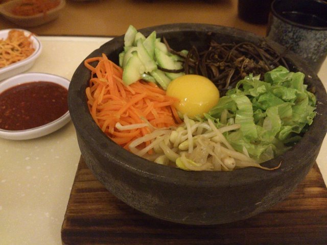 丰盛町地里面餐厅布局都比较窄,由于可能地方小租金贵的原因吧。这里座位都靠得很挤,坐得不是很自在,而且里面还有吃烤肉的,问题没有抽风机,不通风空气不好,里面的气味很重。韩国石锅饭25块,配了一碗紫菜汤,一碟泡菜和凉拌青瓜。韩国石锅饭里面都是素,没有一点的肉,只有一个生鸡蛋,还好配的拌饭酱味道还不错,有这个拌饭酱能把整锅饭吃完。总的来说,味道还可以,环境一般。…查看更多