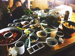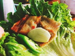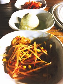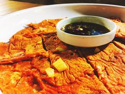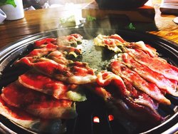 在较场口这边晃荡时已经在意这家店好久,logo字体很流畅,心想一定要来吃吃看,看点评里好多次提到“韩国老板”“味道正宗”这些关键词,期许还是蛮高。总共两层,一层有放映kpop的mv,歌嗨气氛冷,大家都在自己吃着自己盘里的肉,没话聊才会瞥一眼电视;二层室外卡座人气高,虽然也美什么风景可看,可以感受到凉风心情更爽朗。装潢上力度不够,设计感可以更强一点。团的两人餐,分量大大超出预期,愣是差不多摆满了四人桌,本来饿到可以吃掉三人份的我看到菜全部上齐自感都五分饱了。蘸料是海盐、香油胡椒、辣椒面和醋料,喜欢大豆酱的也可以让服务员上。猪五花有厚和薄两种,蘸香油胡椒最搭,蘸海盐咸味不均匀,五花肉差一口肉香,说老也能啃,肉质不美好。梅花肉真的就太老了,烤出来和肉干无异,还是喜欢肥瘦相间肉味十足的那种。牛五花没货换乘牛胸肉,比猪肉要好吃,两个人根本无法吃完全部,服务员非常高效地烤,盘子已经堆成了肉山。盐烤鸡胗里面大蒜最好吃讲真,要不是有蒜味我以为自己在吃芋头。泡菜饼吃了一块就放筷子了,可以很清晰地辨别出鸡蛋饼和泡菜两种分离的味道。石锅拌饭只能看而已,辣酱加完也不好吃,问题到底出来哪里啊= =服务员态度好,热心助力烤肉,并且打包不收费,纸袋是之前前身鹿西的。撇开正宗不正宗,烤肉本事真的不太给力,份量取胜,有看到说韩语的一家四口来吃,情绪高涨,不晓得是不是第一次过来。…查看更多