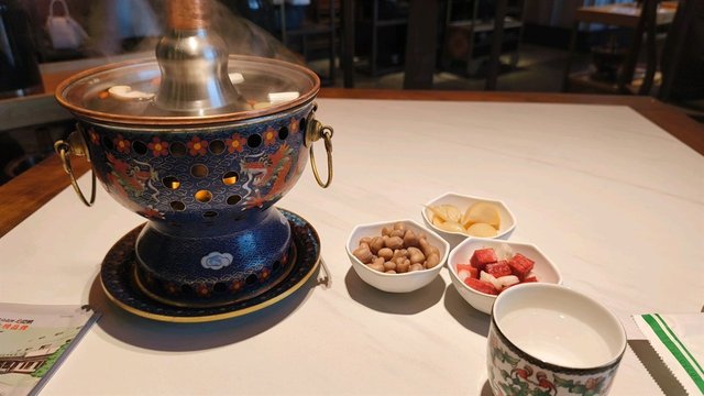 獨自來這裏吃晚飯,要基本的火鍋,經典麻醬,餐廳奉上一些前菜,包括一小碟花生、一小碟醃菜及蕎頭。因為這間餐廳是出名吃羊肉的,所以我點了羊肉。我點了餐牌上推薦的羊腹肉$39、又點了一份鮮羊肉$50,份量很足,但怕羊騷味的人不會愛吃。景南鍋的湯底比較清淡(有紅棗、杞子、冬菇、蝦米、薑等),突出食材本身的味道。另外點了一份芝麻餅小食$2,裏面是芋頭餡的,有孜然粉的味道。作為深圳的首間分店,店內的空間很大,我一個人也坐著一張四人枱,相當舒適。服務員的態度相當積極,十分願意幫忙,值得欣賞。…查看更多