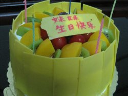 宝贝生日,去定做了一个蛋糕,有很多选择,但系基本最少要1.5榜才会做,这个蛋糕接近七十个大洋,要是有一磅的选择就好罗~~外层包裹着一片片的巧克力,可能刚从冰箱拿出来,有点硬~~上面外层用黄桃和奇异果铺排,奇异果可能不是季节时候,很酸,然后黄桃一般都是罐装的,不是新鲜的水果,一般般,里层是蕃茄和葡萄,这两个水果还不错,都是我喜欢的水果,然后底层是夹心蛋糕,中间有一层黄肉粒~~给人的感觉不单调而且带出粒粒果肉的味道~~…查看更多