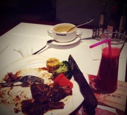 地点非常的方便,昨天晚上刚去吃过,西餐嘛餐厅都是灰蒙蒙的,灯光很有感觉的,这家店是同事推荐去的,因为他们家点两道主食,然后饮料什么的都是自助的,所以比较划算,我点的是主厨推荐的牛排,7分熟了,牛排名字想不起来了,反正7分熟刚刚好,喜欢吃,很嫩很嫩的,配的玉米和西兰花我居然也吃掉了,西瓜汁也不错,稍微有点厚,估计是没有惨水的,所以才这样,很不错的…查看更多