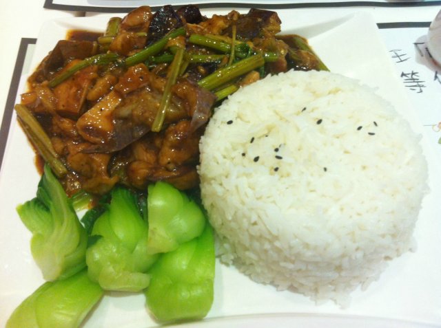 餐厅开了没有多久,里面的设施还是比较新的。餐厅基本上都是卡座,坐的 比较舒服。本人最喜欢这里的大电视 还有手绘的餐纸 很可爱说到食物。中午来吃还算比较优惠。一份餐20元左右 加不同的饮料 价格不一样。 冻柠茶3块 还是可以接受的。这份是茄子鸡,味道不错。茄子的味道很浓郁 配白饭很美味。 而且白饭的份量还算比较多。总体来说很满意哟…查看更多