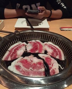 吃的烤肉拼盘,超级大的一份啊,里面有五花肉,五花肉分量很多,吃起来很爽,肉质很有弹性很新鲜,牛舌,肉质紧实,嫩嫩的,不喜欢烤太熟吃,服务员服务很好,一直有帮我们换烤盘,唯一不满的就是烤肉烟味很大。…查看更多