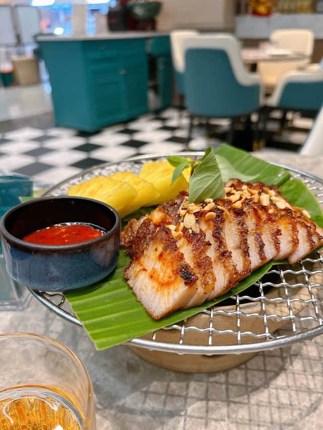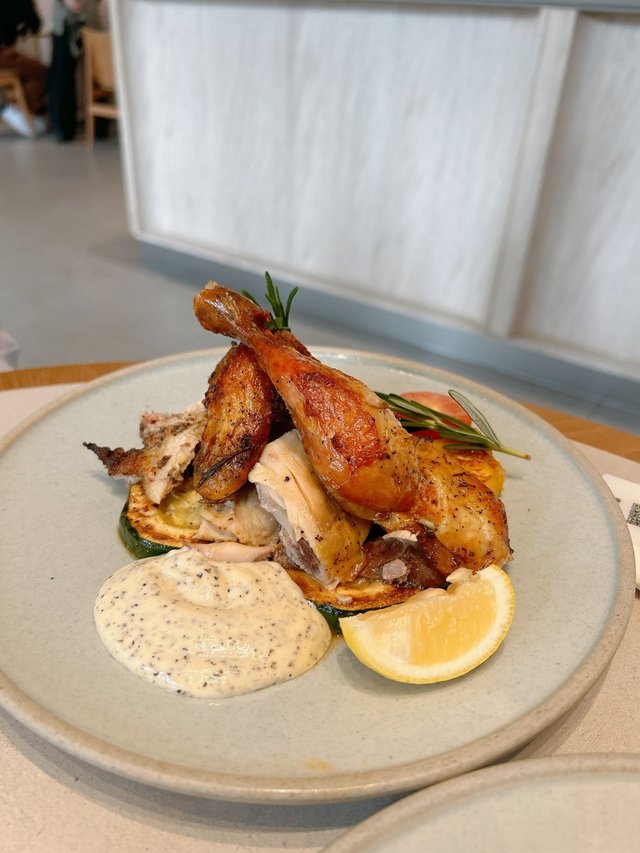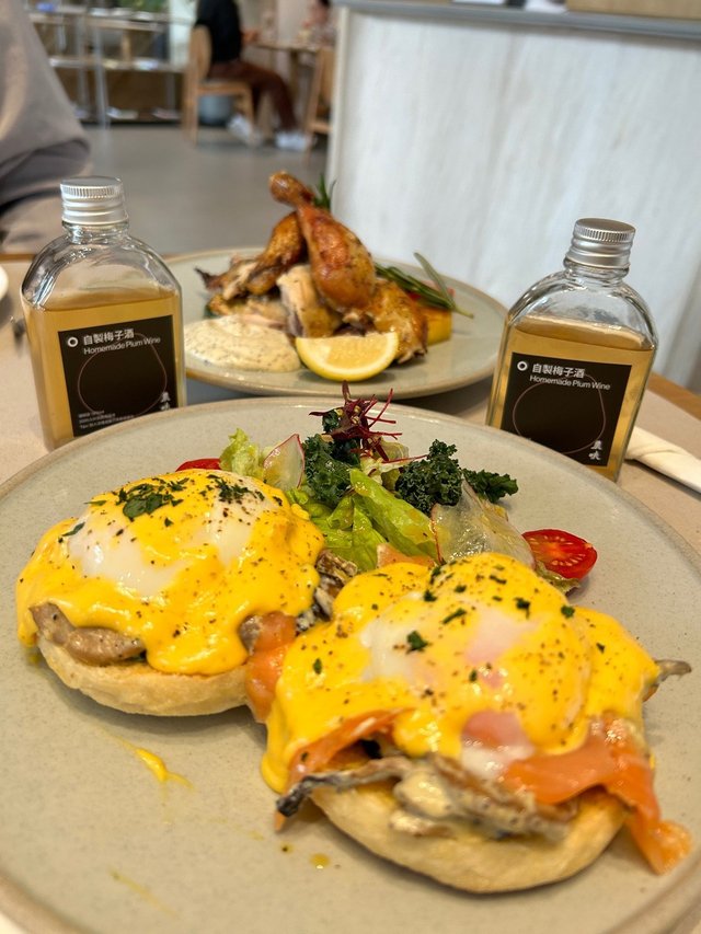 餐厅装修简约有格调,以木调为主。位置宽敞 有室外和室内两个分区。天气好的时候坐在外面应该蛮舒服的。作为简餐,餐品选择也不少😘*~~~~*~~~~*~~~~*🔸63度温泉蛋黑松露蘑菇+三文鱼¥ 68+ ¥ 20卖相漂亮,松露味道刚好,不会过头👌🏻 中间夹着满满的蘑菇片,底层是英式玛芬。切开流心蛋黄,流出蛋液里满烟熏的三文鱼,口感丰富😋🔸迷迭香烤鸡(半只)¥98三黄鸡腌得很入味 ,鸡肉是切好摆盘的,不需费力去切开😉外皮金黄酥脆,肉质嫩滑又有弹性,跟冰鲜的没法比👍🏻👍🏻。不吃辣的还可要求不放辣椒🌶️粉在面上。*~~~~*~~~~*~~~~*这里的服务也不错,店员都是面带微笑的,还会主动帮忙拍照及下单。…查看更多