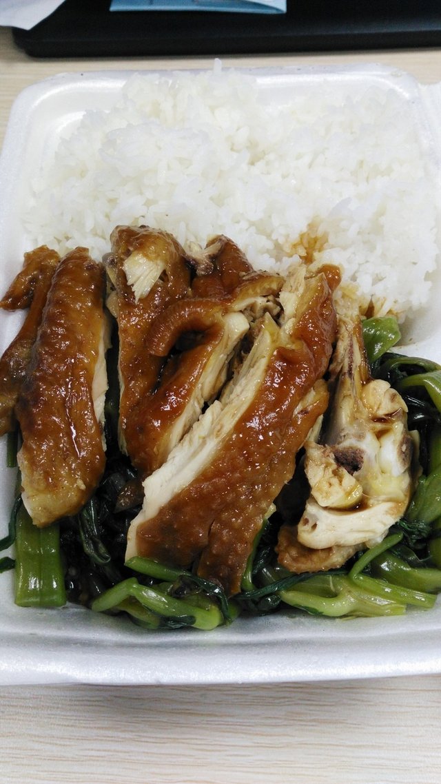 这家快餐第一次吃,同事推荐的,有点期待它家的烧鸡。但是收到餐我有点吓一跳。。。这个真是小小的烧鸡,居然有一个鸡的一半,可想而知这鸡有多小只,都不知才养多久还这么小就吃了,感觉有点怕怕,我本来以为就是几块烧鸡肉~~~这个烧鸡感觉是炸过的,比较干,肉质也有点霉,连着骨头的地方还有一点点红,配菜只有一小格豆芽和半只卤蛋,没什么味道,没有青菜。我同事点的黑椒鸡扒,以为是铁板有汁的扒,但原来是像M记和K记的炸鸡扒切成一块块,还比较辣。下次不再吃的可能性比较大。…查看更多