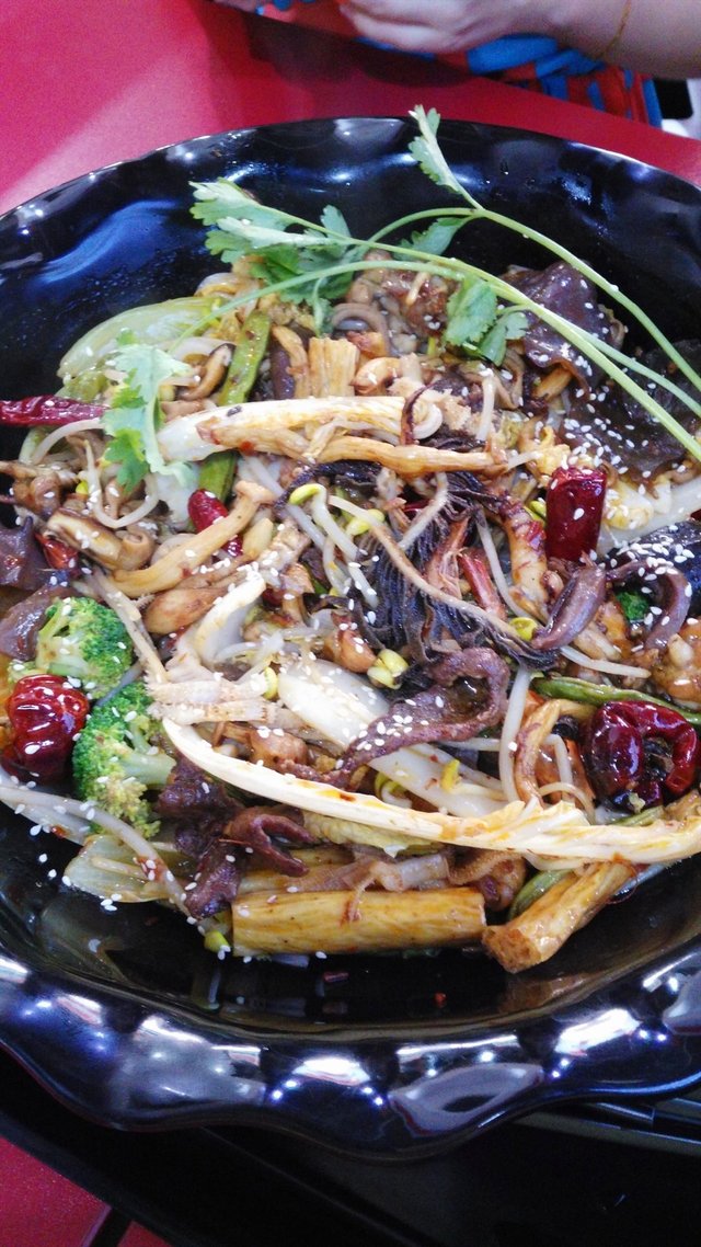 店在数码城的四楼,就餐环境是开放式的,所以比较吵杂,桌子摆得比较拥挤,不好坐也不好通过。这里是自选荤素菜去称重,按斤算,荤菜50多/斤,素菜30多/斤,比较贵,性价比不高,称重买单时服务员没问要干锅还是湿锅,默认是干锅,这里微辣比较符合广东人的口味,再辣估计吃不下了。这一锅总共97块,选得挺多的,但炒出来只有这一些,吃的时候特意看看吃了什么,发现有些菜和肉明显少了,有些特意加的根本就没吃到,所以几个小伙伴一致怀疑店家在里面炒(不开放看不到)的时候把我们的菜夹出来了。好多辣椒炒的,重口味吃不出原来味道如何,分量又少了,下次应该不会再光顾了。…查看更多
