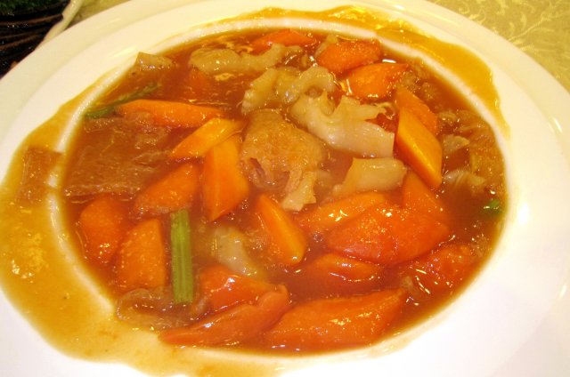 宝庆府 - 湘/粵菜 宝庆府(春风店) 2010-08-15今天没有特定的目标,志在发掘一些新鲜的地方,碰巧路过这里,碰巧肚子又抗议了,看看店里面来吃饭的人还不少,于是决定今晚就是这儿了。1. 小食 (3/碟) : 花生和涼拌海带,很一般的小吃。2. 卤水拼盘 (38/碟) : 很失望,里面有干切牛肉片,牛干,牛肚,豆腐干,全部都是干巴巴的东西,不是南方人吃惯的卤水拼盘,除了牛肉片,其它嚼的都很费力。3. 木瓜花胶煮鱼肚 (78/碟) : 焖的时间很长,所以鱼肚很入味,相比之下花胶没那么入味,让我很疑惑是不是在同一个锅里面焖出来的,好在有美味的汁搭配着,不算太失望。4. 鲜果咕噜肉 (28/碟) : 味道不错,炎热的夏天,甜甜酸酸的比较和口味,菠萝和肉比较少,番茄,洋葱,青椒,倒是不少。5. 罐焖辽参 (68/碟) : 参还是焖的很软的,味道也还不错;不过看样子不像辽参,这个价钱感觉像是被人宰了一刀。68块还是特价的哦!6. 鸡汁黄花菜 (32/碟) : 干的黄花菜平时见的多了,叫金针菜,广东人最喜欢用它来蒸鲜鸡,今天看见新鲜的,当然不能放过,菜本身就很鲜甜的,配上火腿和鸡汁,搭配的很好,唯一遗憾的就是油了一点点。食后感 : 虽然味道还不错,但是没有想立即下次再来的冲动!…查看更多+ 2以上食记乃用户个人意见 , 并不代表OpenRice之观点。赞好分享宝庆府 - 湘/粵菜 宝庆府(春风店) https://s.openrice.com/KtLT0W0E0m000检举 张贴 评分4味道4环境4服务4卫生3抵食推介美食木瓜花胶煮鱼肚鲜果咕噜肉鸡汁黄花菜用餐日期2010-08-14人均消费¥125 (晚餐)