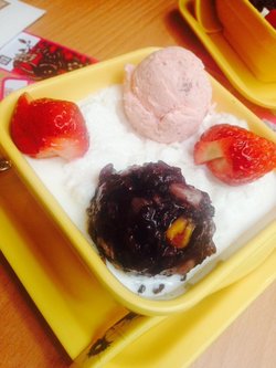 满记甜品每周三买一送一,雪山草莓31元买一送一,果断的来了一份,这个算是季节性产品吧,两个草莓,一个草莓冰激凌球,一个血糯米球,下面铺垫着的都是白雪,个人喜欢把草莓先吃了,把草莓冰激凌球,血糯米球和白雪混在一起吃,和单独吃的味道肯定不一样,这个要看个人喜欢怎么吃的,总之一句话怎么吃都行!…查看更多