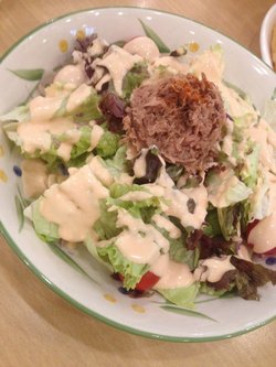 和老妈去逛街,想吃点色拉,就觉得来了这样,周六没什么人,服务员也是爱理不理的,翻了翻菜单点了点金枪鱼色拉,披萨,鸡翅等各类小吃,个人还是偏爱金枪鱼色拉,色拉很清口,就是色拉酱不够多,二话不说立马问服务员再多拿了一份色拉酱。 色拉 多色拉酱 才好吃吗!!!…查看更多
