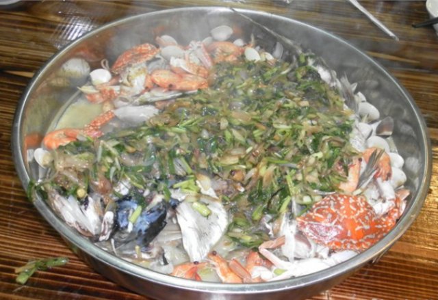 这里环境一般般吧,就是餐厅内装修还可以,对吃海鲜来说也很有气氛,服务态度还行,上菜时间也比较快,最主要这里的海鲜还蛮新鲜的, 这里的海鲜大盘鱼特别推荐,虾特别的多,虽然不是很大只,还蛮新鲜的,特别嫩,味道很不错,螺也多,只是有些没了肉.…查看更多