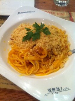 中午和同事过去吃午饭,一家新开的店,就在美罗城四楼的欧风街里面。我点了培根芝士意面,同事们点了奶油鸡肉面和牛肉酱意面,还有芝士蒜香面包。总体感觉3份面都不怎么样,四五十的价格也不便宜。面包上来的时候还是烫的,上面有热热的芝士,倒是意外的好吃!我的培根芝士面黏黏的,吃到后面都有点一坨坨粘住,完全不想吃了。 饭点过去的时候,排队排了大概二三十分钟,和带位的服务员聊天,得知每满50元可以送20元代金券,所以我们想点满150元,才点了面包充钱,结果咧结果咧?吃完后问服务员要代金券,才知道活动结束了!带位的那个服务员,你在搞什么啊?自己店里活动都结束了也不知道啊? 新店开业,也没任何活动,感觉价位、活动、口味都蛮失望的。一般不会再去!…查看更多