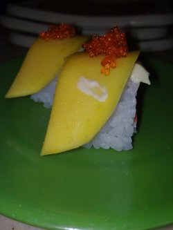 以前就觉得日本料理很奇怪,一坨冷饭再加上一块生肉,真的难以想象会是是什么味道,现在在再加上一片芒果,更加不理解了。不过看造型听好的,照片拍得也不错。似乎女生都挺爱吃寿司的。网站上看见的几位寿司控也都是女生,有机会得去尝尝。