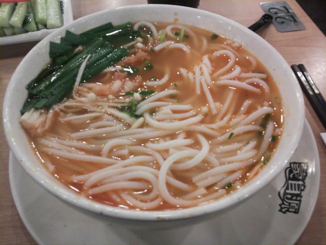 最近在网上团购了蒙自源的1个套餐: 云南酸辣牛肉米线+凉拌青瓜, 13.6元. 今天中午时分经过北京路, 就顺便去消费. 位置其实很好找, 就在北京路与中山五路的交界处, 真功夫的楼上. 真工夫在2楼, 它在3楼. 因为相差了1层楼, 所以明显生意没有真功夫好. 我到的时候大概中午1点钟, 真功夫是差不多满座了, 蒙自源才5-6成上座率. 因为是团购, 所以等候的时间都比别人长. 但出品还是不错的.…查看更多