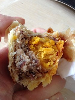 蛋黄酥自从看广告买了一次后,爱的不要不要的。价格很贵,一个还不管饱,所以只允许一个星期买2回。买了玫瑰和什么芝士味的包装。玫瑰味的,圆滚滚的外边有很像腰果片的东西。最里是一颗完整蛋黄,外面裹的是有玫瑰花瓣的东西,甜而不腻…查看更多