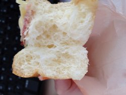培根芝士面包,不长的一个,有纸托,固型外还方便拿取。面包上是芝士,芝士和面包中间是薄薄的培根,可能是经过2次烘烤,培根又薄的原因,培根不软。面包发的大,松软极了,喜欢…查看更多