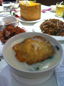 生日请家人吃港式餐厅,说实话,这餐是我们最近半年吃过最舒服的一次赶上周四烧鸭特价,18元,味道不错,给两种酱汁过生日送了长寿面,只是还要看身份证,有点不爽啊。。。谁还骗碗面吃。。避风塘鸡翅,日昌也有,味道差不多咸蛋黄焗茶树菇也很香!!就是有点油腻,吃多了不舒服,但是炸的很棒。招牌牛腩,酱汁真的很香啊~~~虽然量不大,真的很浓郁,好吃香煎鲈鱼也挺嫩的,好吃,香菜也全部吃光光了服务挺好的,不温不火,但也周到细致。晚餐时段人很多,大厅里很嘈杂.价格小贵,感觉比日昌贵点点,但是味道比日昌好总之下次还会来的,这是第一次尝试…查看更多